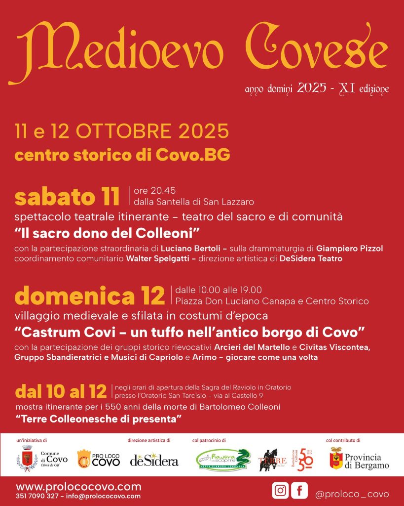 • Sabato – Spettacolo itinerante con partenza dalla Santella di San Lazzaro (via De Micheli). Regia di Walter Spelgatti (DeSidera Teatro), con la partecipazione di Luciano Bertoli. Lo spettacolo celebra il legame tra Colleoni e Covo attraverso il dono della reliquia di San Lazzaro.