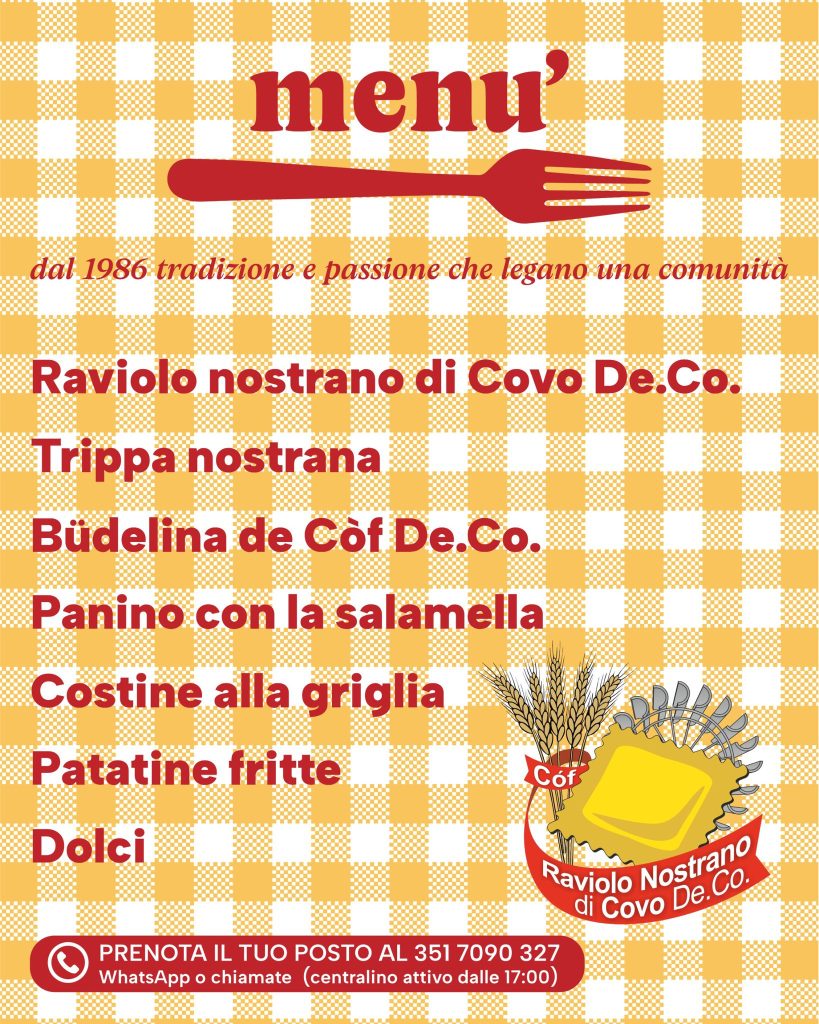 Il cuore della manifestazione è il raviolo nostrano di Covo, preparato secondo la ricetta De.Co., tramandata da generazioni e custodita con orgoglio dalla comunità. Un’esperienza culinaria che richiama ogni anno migliaia di visitatori da tutta la Lombardia.