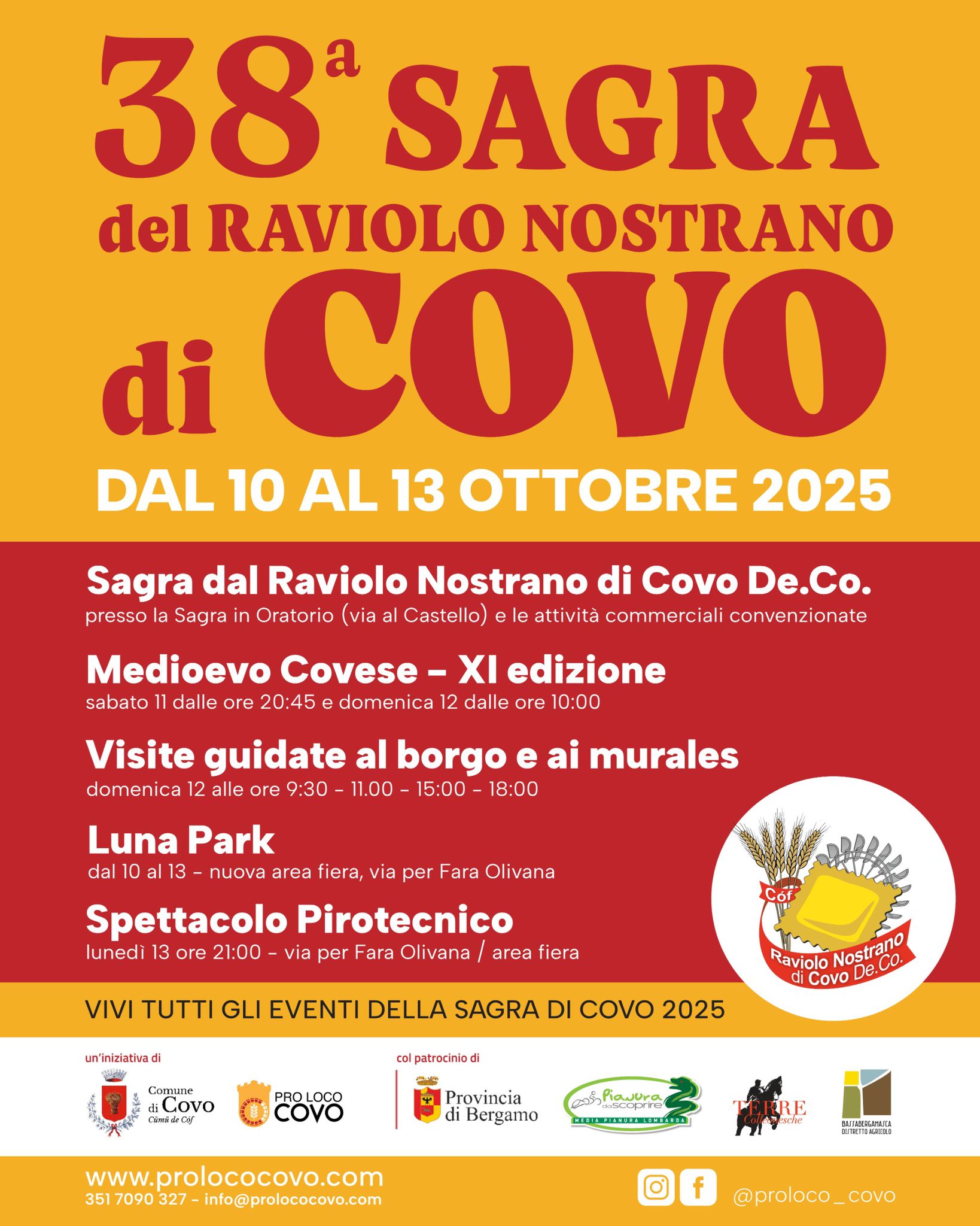 Dal 10 al 13 ottobre 2025 il borgo di Covo (BG) torna a essere protagonista con la 38ª Sagra del Raviolo Nostrano, un evento che unisce gusto, tradizione e cultura. Quattro giorni intensi per celebrare il piatto simbolo del paese – il raviolo nostrano fatto a mano – insieme a visite guidate, rievocazioni medievali, spettacoli e momenti di festa per tutta la famiglia.